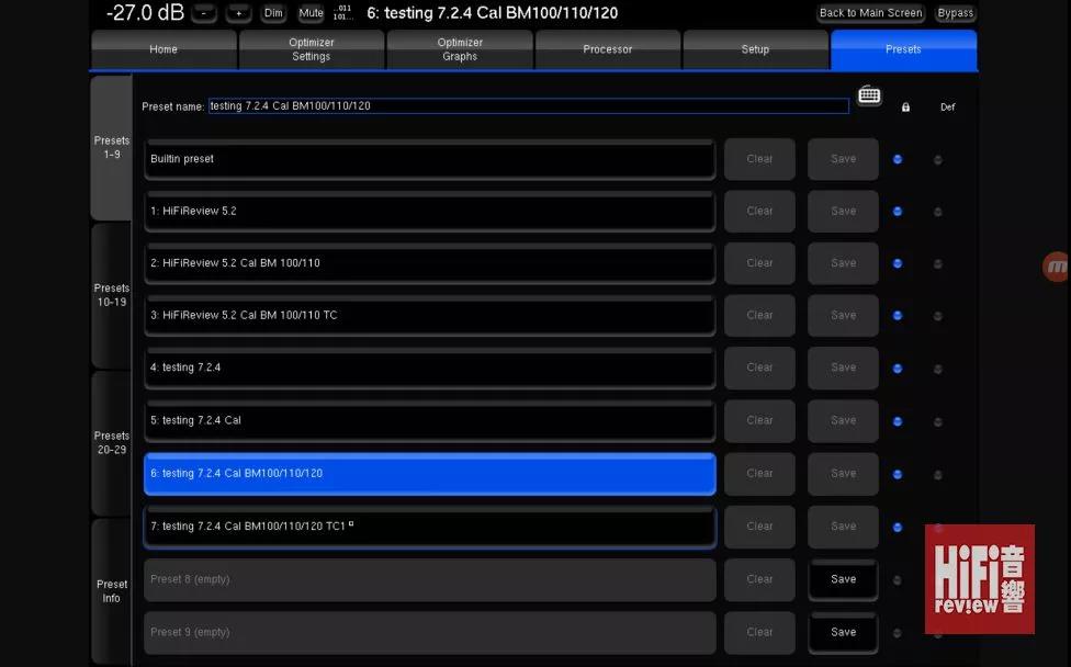 ▲ 你可以儲存多個記設(shè)置并自定名稱,如5 – 是只用 Optimization 係的修正效果;6 – 再仔細修正分頻點,如前中置 100Hz,環(huán)繞聲 110 Hz,頂置聲道 120Hz;7 – 在 5+6 的設(shè)置中,再加入 Target Curve,即個人口味設(shè)置,你便可以立即比較不同設(shè)置的分別。