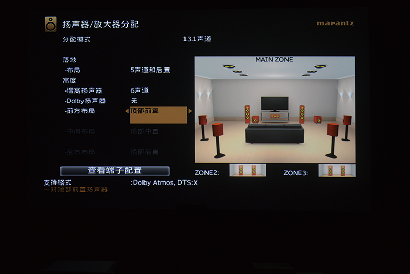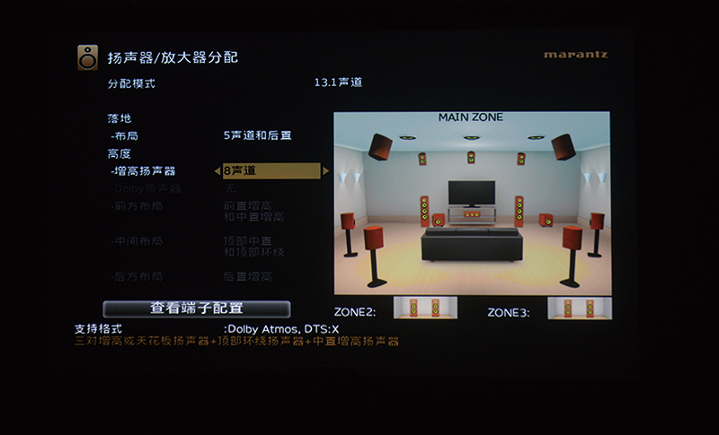 當我將AV8805連接到系統里面的時候,我發現AV8805 的平衡和非平衡模擬輸出接口是17個(其中2個超低音聲 道),也就是說AV8805是15.2聲道輸出的,可是官方上卻標 明是13.2聲道?那么另外多出來的兩個聲道是干什么用的? 當我打開AV8805設置菜單里面的放大器分配頁面才發現, Marantz的目的就是為了實現將Dolby Atmos、DTS:X和Auro3D三者的揚聲器布局進行兼容。也就是說,你可以在視聽室 里面安裝最多17只揚聲器,但在播放的時候同時最多只能用 15只揚聲器發聲。我這次使用的是7.2.6配置的三維沉浸式音 效家庭影院音箱配置。