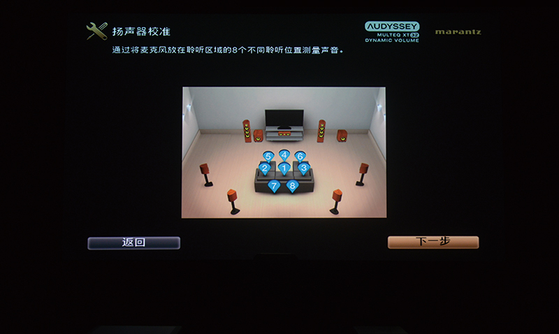 Audyssey MultEQ XT32自動聲場校準,需要用家在聆聽區域內以8個參考測試點進行數據采集,并且要求測試麥克風的高度與人耳齊平